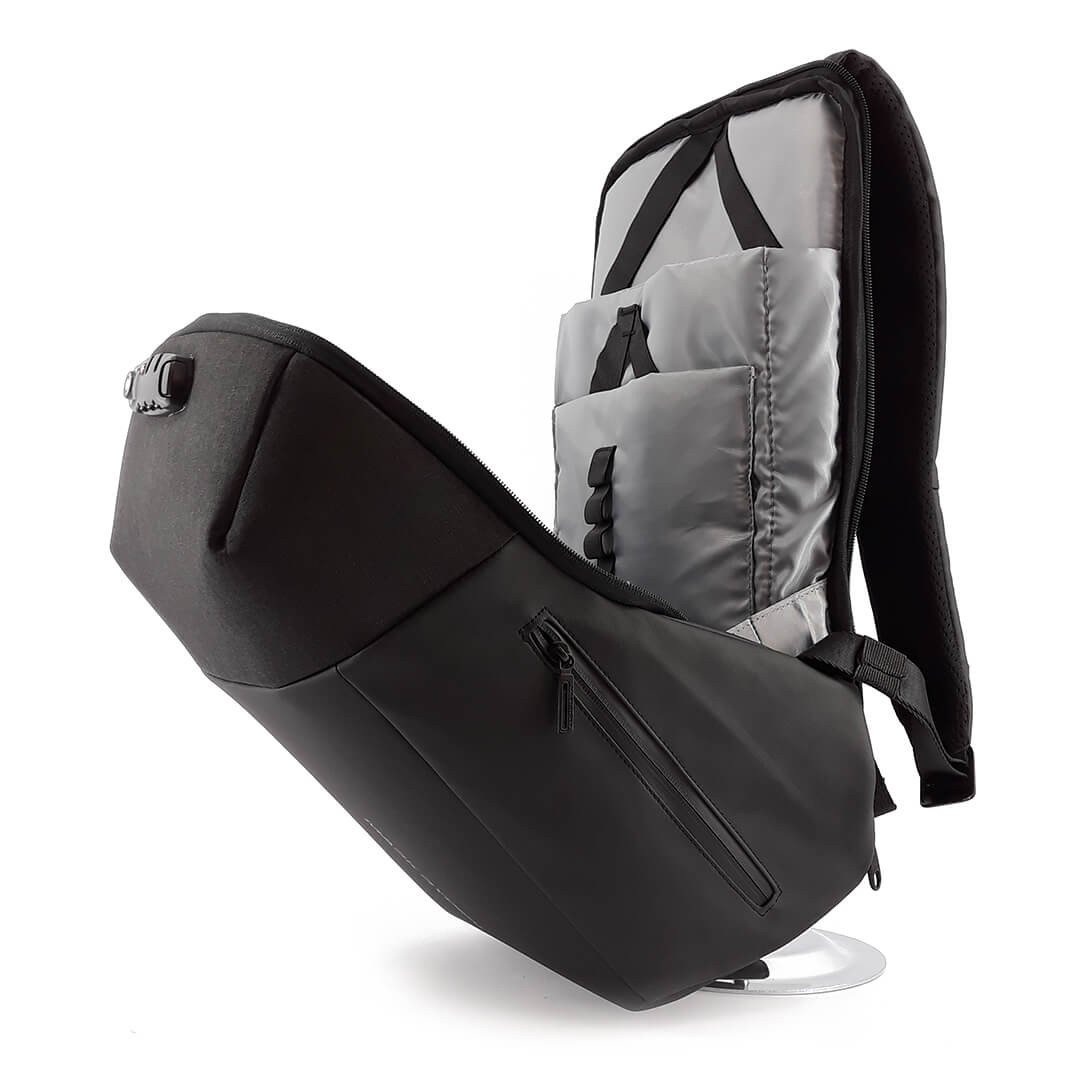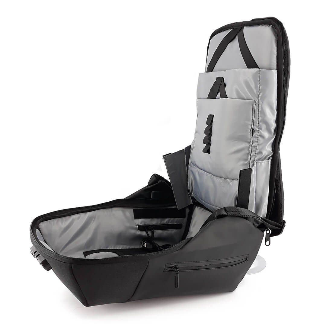 À l’intérieur, en plus de couches rembourrées absorbant les chocs, des plaques en polypropylène résistantes sont intégrées – elles ne peuvent pas être tranchées au couteau ou à la lame. Ces plaques protègent vos affaires sur quatre côtés : en haut, en bas et sur les côtés. Le dos du sac est orthopédique et respirant. Les compartiments intérieurs sont agencés de manière à répartir correctement le poids et soulager les épaules et le dos. De nombreuses poches fonctionnelles vous permettent de garder le contenu bien organisé, chaque objet ayant sa place dédiée.